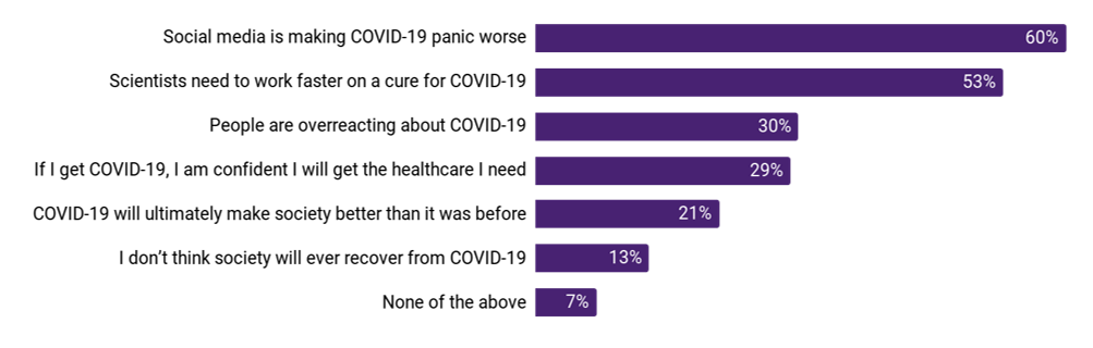 - 6 of 10 believe social media is making the panic worse while 30% believe that people are overreacting to COVID-19.