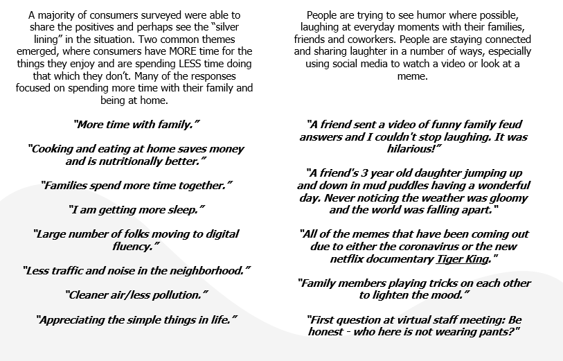 - Many are happy to be spending more time with their families and less time driving / commuting. They are also trying to see humor where possible, laughing at everyday moments with their families and especially turning to social media to watch a video or look at a meme.