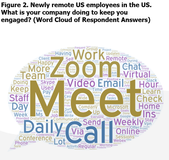 Very few respondents reported that their companies were already sending them gift cards or food deliveries to help keep them engaged. Most initiatives have been focused on connectivity and communication, and striking a balance between productivity and wellness. One respondent said that their company had “implemented a points [program] where you can grant to coworkers for their work and you can cash in for gift cards.”