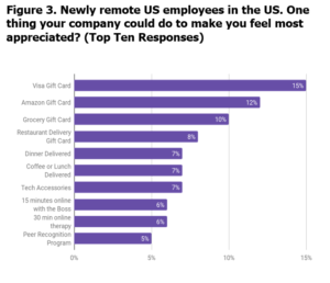 About 50% felt that some type of gift card would make them feel most appreciated, with restaurant, dinner or coffee delivery in second place for about 22%.
